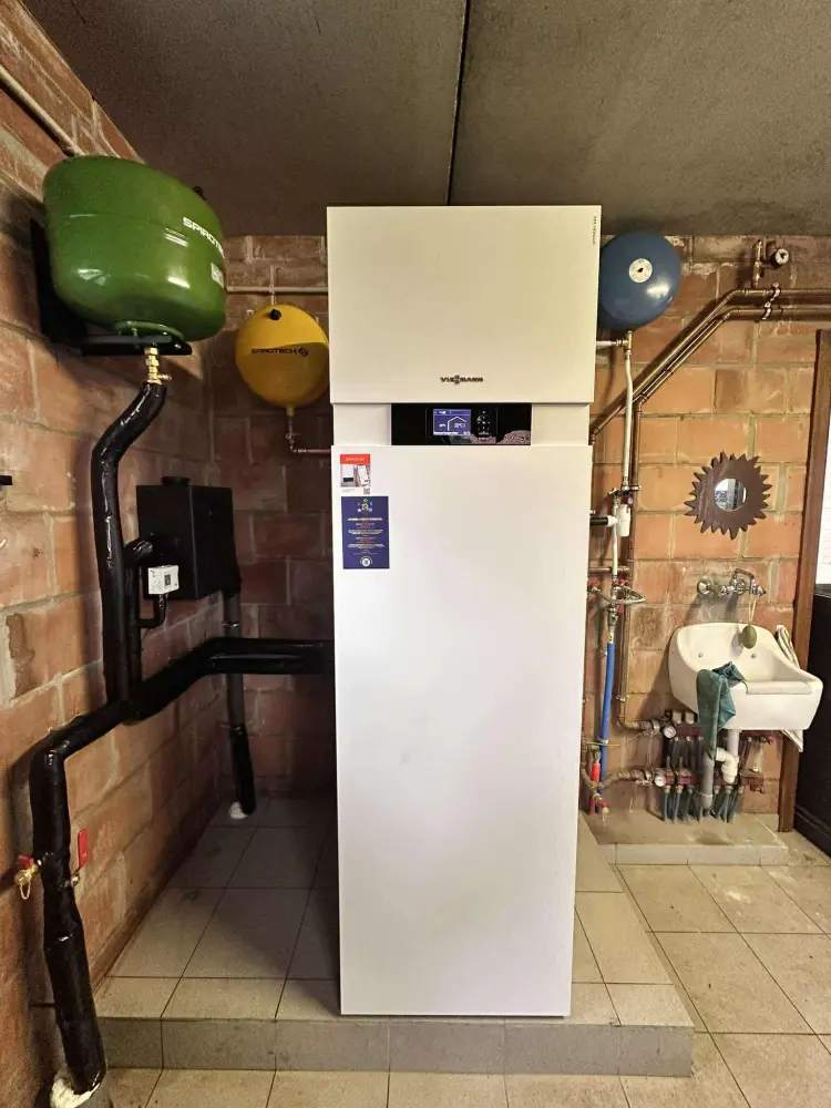 Installatie geothermie warmtepomp met ingebouwde boiler (plaatsbesparend) van het merk Viessmann.
